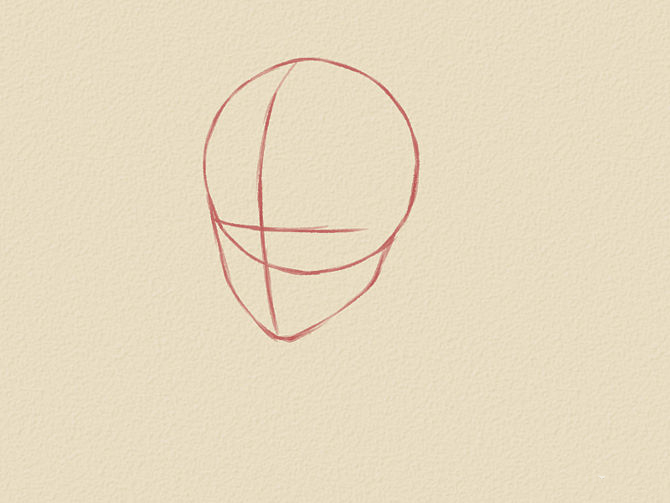 Bước 1: Vẽ phác thảo của khuôn mặt bằng một vòng tròn và một hình dạng góc cạnh dưới hình tròn cho phần quai hàm. Chia tỉ lệ các chi tiết mắt, mũi, môi.
